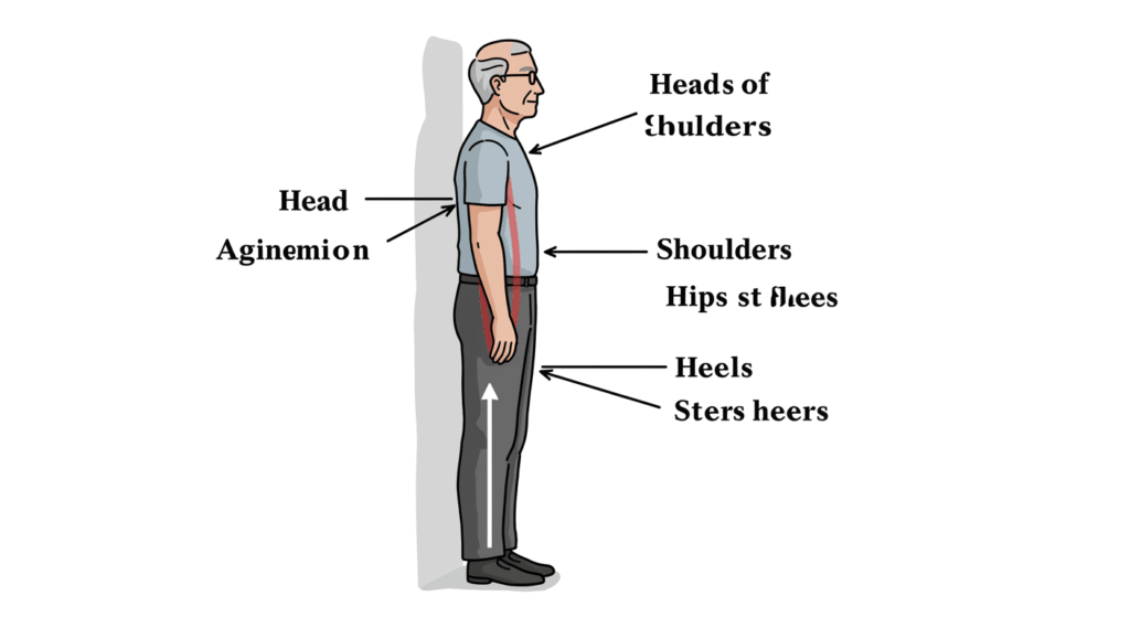 後頭部・肩甲骨・お尻・かかとを壁につける。自然に4点がつけば合格。 - 鏡ラインチェック