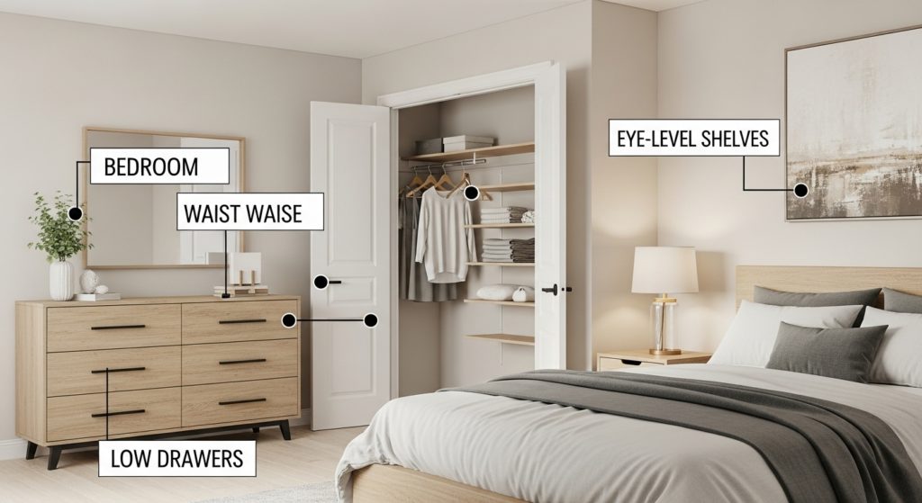 年齢とともに可動域が減るシニア世代には、「取りやすい高さ」と「短い動線」が不可欠です。