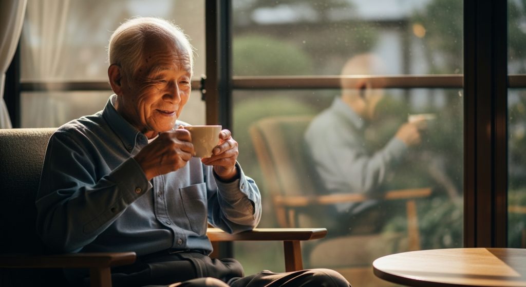 - 朝、陽の当たる窓際でコーヒーを飲む