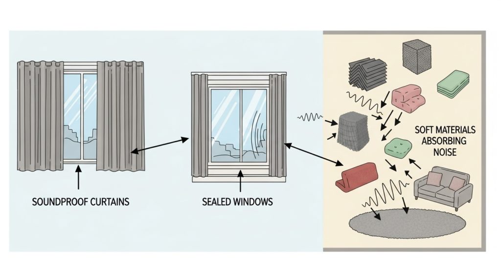 - 廊下や扉周りに“音の吸音材”を配置